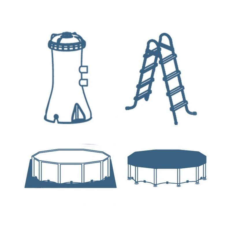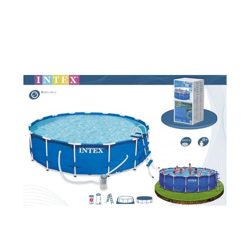 Frame pool (MERK INTEX) zwembad zeer sterk en eenvoudig op te zetten het zwembad word opgezet door het sterke gegalvaniseerde buizenframe in elkaar te zetten en daar de extra versterkte pvc folie in te plaatsen. +/- 30 min. kan het bad al klaar zijn om gevuld te worden. het zwembad wordt compleet geleverd met gekeurde filterinstallatie 12V, oppervlakte skimmer, extra groot filterelement, grondzeil, afdekking, ladder, opbouw instructie en videoband. Bij dit zwembad wordt tevens meegeleverd: